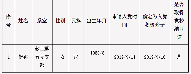 经教工第五党支部培养考察,在听取党小组、培养联系人、党员和群众意见的基础上,经党支部(或支委会)讨论,确定祝娜同志为发展对象。现根据学校发展对象备案制度进行公示,公示期为2020年11月4日-9日。如有意见,请...
