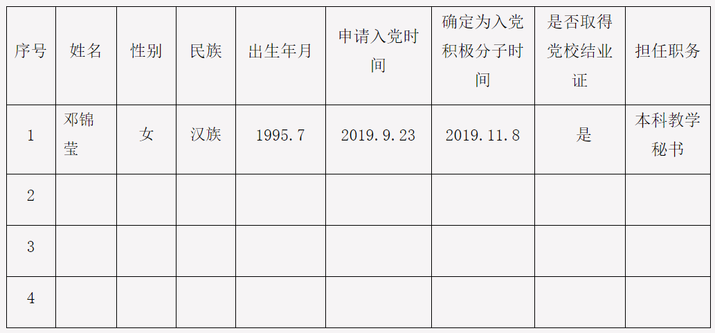 经学院教工四党支部培养考察,在听取党小组、培养联系人、党员和群众意见的基础上,经党支部支委会讨论,确定邓锦莹同志为发展对象。现根据学校发展对象备案制度进行公示,公示期为2021年3月4日-8日。如有意见,请在...