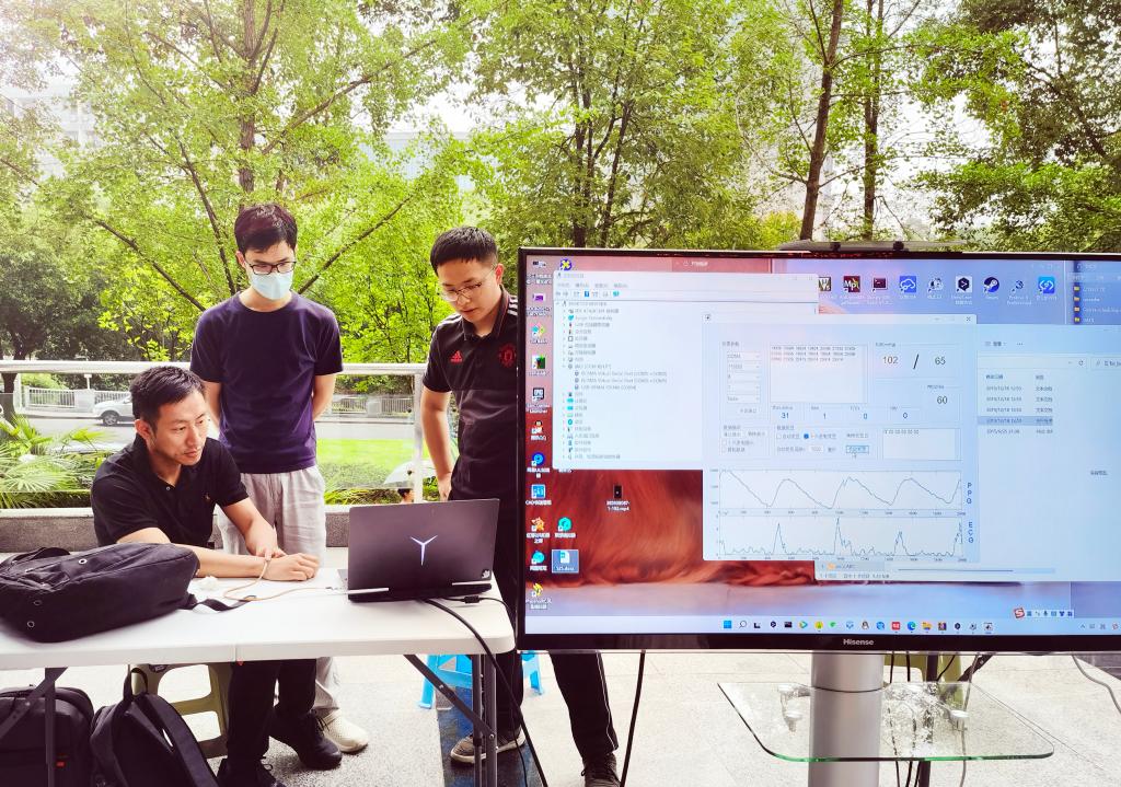 智能手环能够实时测量血压、脉搏等生理体征,吸引了大量师生前来体验,可通过每天持续收集体力活动等数据,使医疗服务提供者能够远程监控佩戴者的体力活动情况并据此制定个性化的干预措施。手环不仅在跟踪体力活动方面受到广泛关注,还能够与手机等便携式无线可视化终端进行有效连接,终端可将监测结果直观地反映给患者及其家属,并在生理指标异常时发出警报。