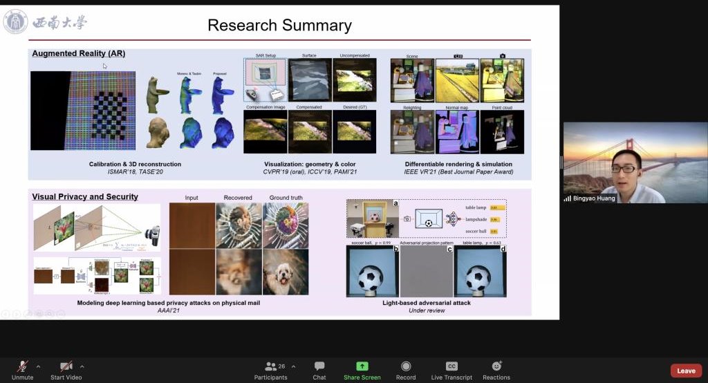 我院三位教师分别作了主题报告。黄兵姚教授强调空间增强现实(Spatial Augmented Reality)旨在通过投影仪-相机系统(ProCams)将可交互的视觉内容叠加于真实世界;相比于传统增强现实(AR),更利于在多用户中分享虚拟内容,并提出了一种名为DeProCams的统一方法,用于同时实现重新打光、投影仪补偿和三维重建;对于SAR的隐私和安全,分别介绍了 Neural-STE和SPAA用于信件隐私攻击和基于投影仪的对抗性攻击。杨铮教授介绍了其发表在FSE 2022的最新论文研究成果PLCrypto: A Symmetric Cryptographic Library for programmable Logic Controllers, 具体阐述了在PLC上安全并高效的实现密码算法面临的问题和挑战以及解决方案,并展示了相关的实验结果。刘波博士报告了从单体系统架构到微服务系统架构转换的自动化方法及支撑工具,强调了微服务系统构造技术的自动化、智能化乃至群智化开发方法的研究,既符合当前智能化软件工程的趋势,也将对产业界新型软件系统的工程化提供有力支持。