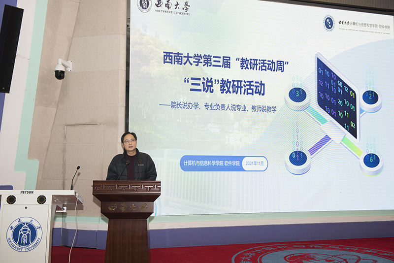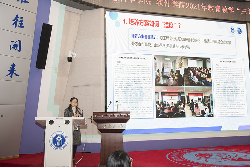 为全面贯彻党和国家的教育方针,深入贯彻新时代全国高等学校本科教育工作会议精神,坚持“以本为本”,全面建设高素质专业化创新型教师队伍,落实立德树人根本任务,落实“学生中心、产出导向、持续改进”的教育教学理念,提升教师教育教学水平,按照《PA视讯一流本科教育建设实施方案》、《关于开展PA视讯第三届“教研活动周”活动的通知》、《PA视讯 软件学院第三届“教研活动周”实施计划》等文件要求,我院于2021年11月19日下午14:30,在25教1楼报告厅召开全体教职工大会,围绕“院长说办学、专业负责人说专业、教师说教学”的主题开展了教育教学“三说”活动。活动由学院分管教学副院长陶丽主持,学校本科教学督导组四位专家、院长肖国强及学院全体教职工参会。