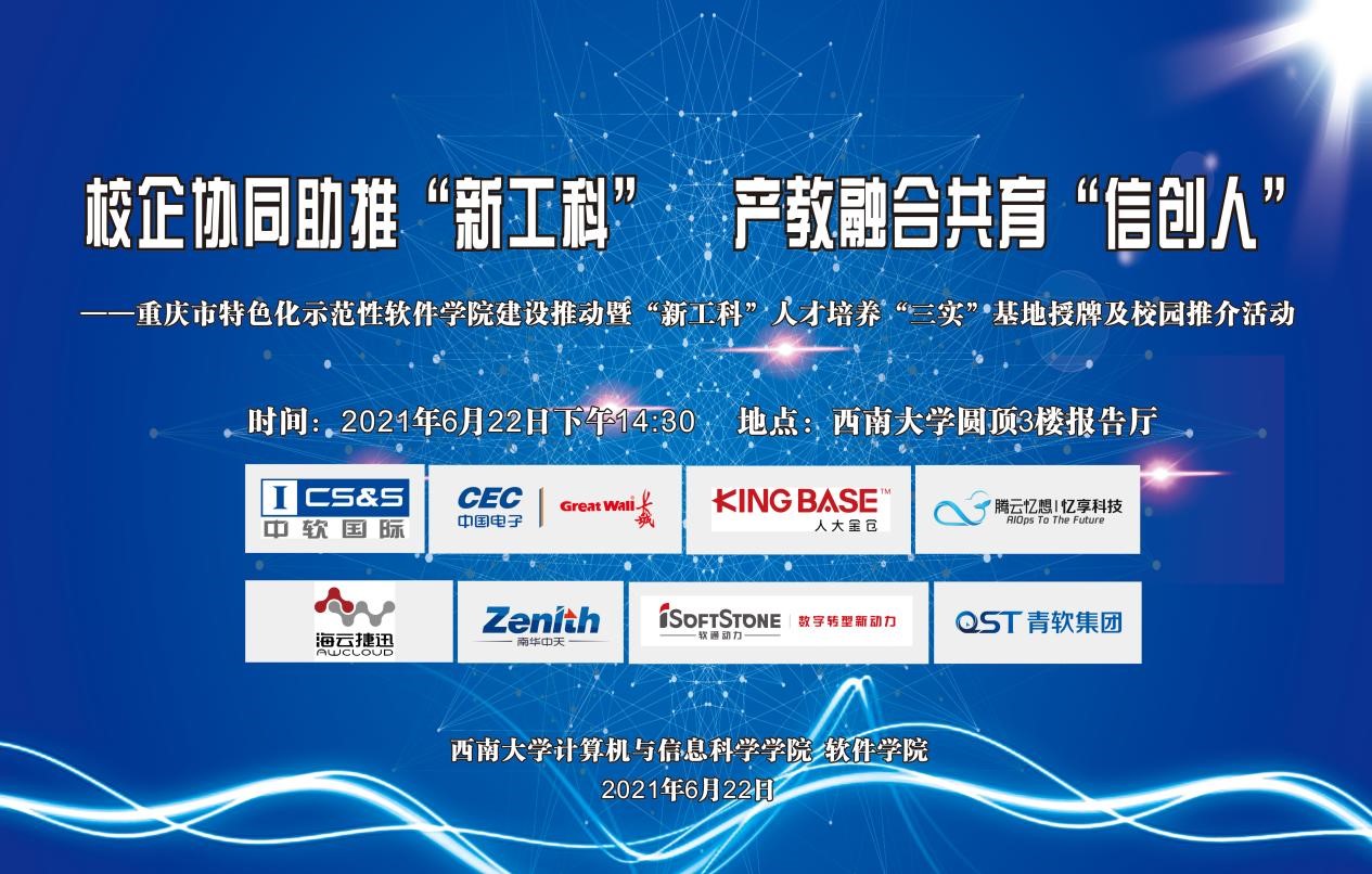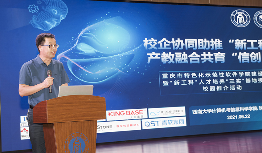 2021年6月22日,PA视讯PA视讯 软件学院在PA视讯圆顶3楼报告厅隆重举行“校企协同助推‘新工科’、产教融合共育‘信创人’”——重庆市特色化示范性软件学院建设推动暨“新工科”人才培养“三实”基地授牌及校园推介活动。PA视讯党委常委 副校长赵国华出席并致辞,PA视讯教务处处长吴能表、PA视讯创新创业学院院长张斌、PA视讯PA视讯 软件学院院长肖国强发表讲话,同时,中软国际教育集团、重庆长城计算机系统有限公司、北京人大金仓信息技术股份有限公司、重庆忆想科技有限公司、重庆海云捷迅科技有限公司、重庆南华中天信息技术有限公司、北京软通动力教育科技有限公司、青软创新科技集团股份有限公司等8家知名IT企业代表分别进行了校园宣讲。活动由PA视讯PA视讯 软件学院副院长陶丽主持。