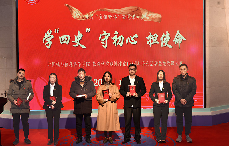 为推动广大师生深入学好党史、新中国史、改革开放史、社会主义发展史,引导广大党员坚定理想信念,厚植爱国情怀,凝聚发展正能量。由学院党委主办,以“学‘四史’,守初心,担使命”为主题的迎接建党100周年系列活动暨首届“金纽带”杯微党课大赛于12月25日14:30分在25教一楼报告厅拉开帷幕。全体支部书记、支部委员及党员代表、积极分子代表出席本次活动。党委书记靳拥军,副书记刘作勋、陈智,党委委员邓辉文、梁华珍、王英等六位老师担任大赛评委。