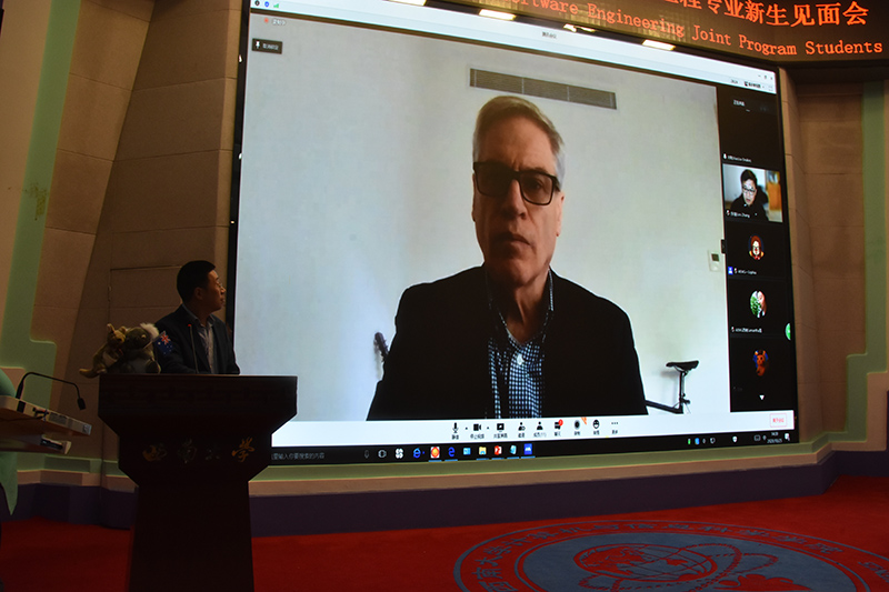 2020年10月25日下午,由我校与澳大利亚迪肯大学(Deakin University)合作举办的中外合作办学软件工程专业本科教育项目召开了2020级新生见面会。受新冠疫情影响,此次会议采取中方线下集中,外方线上在线视频的形式举行。出席会议的有迪肯大学信息技术学院院长约翰·雅伍德教授、国际合作副院长刘晓博士、合作关系主管张愉博士、学生代表PA视讯毕业生迪肯在读的邵迪博士,还有国际合作办公室国际项目经理迈克尔·科克先生、学部国际关系主管露比·李女士;PA视讯PA视讯党委书记靳拥军同志、学术带头人张自力教授、副院长陈武教授、副院长韩毅教授、软件工程系赖祥伟主任、2020级辅导员康静纯老师、教师代表以及2020级软件工程全体新生。