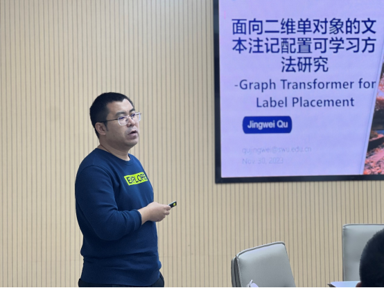 瞿经纬老师聚焦面向二维单对象的文本注记配置可学习方法,强调配置文本注记是增强解释场景中关键元素的主流途径。给定图形输入和注记信息后,如何配置注记才能同时满足几何和美学要求是一个具有挑战性的NP难问题。从几何角度看,传统的规则驱动型解决方案难以捕捉标签之间复杂的相互作用,考虑图形内容将进一步增大难度。因此,他提出了针对注记配置的Graph Transformer,以预测注记位置。