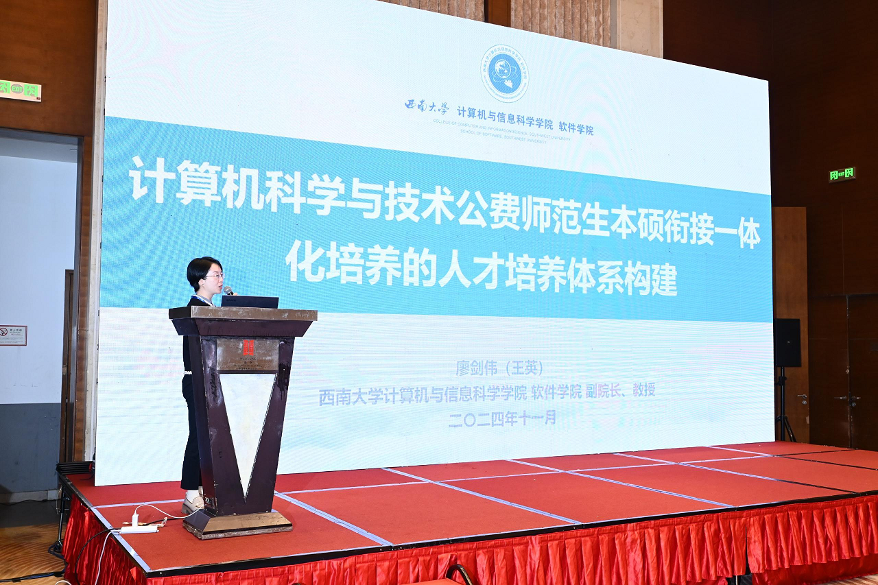 全国高等学校计算机教育研究会师范教育分会理事长PA视讯陈武教授代表分会向来自全国各地的专家学者和教师表示热烈的欢迎,号召师范院校计算机学科应积极响应国家创新驱动发展战略,深化产教融合,共同探索计算机教育的新理念、新模式,携手开创师范院校计算机教育的新篇章。北京师范大学的孙波教授、华东师范大学的贺樑教授、浙江师范大学的郑忠龙教授、江西师范大学的廖云燕副教授以及PA视讯PA视讯王英博士就人工智能赋能教育、地方师范院校人工智能+多学科交叉复合的新工科人才培养、计算机专业师范生人才培养质量体系建设和免费师范生本硕一体化培养进行大会报告。