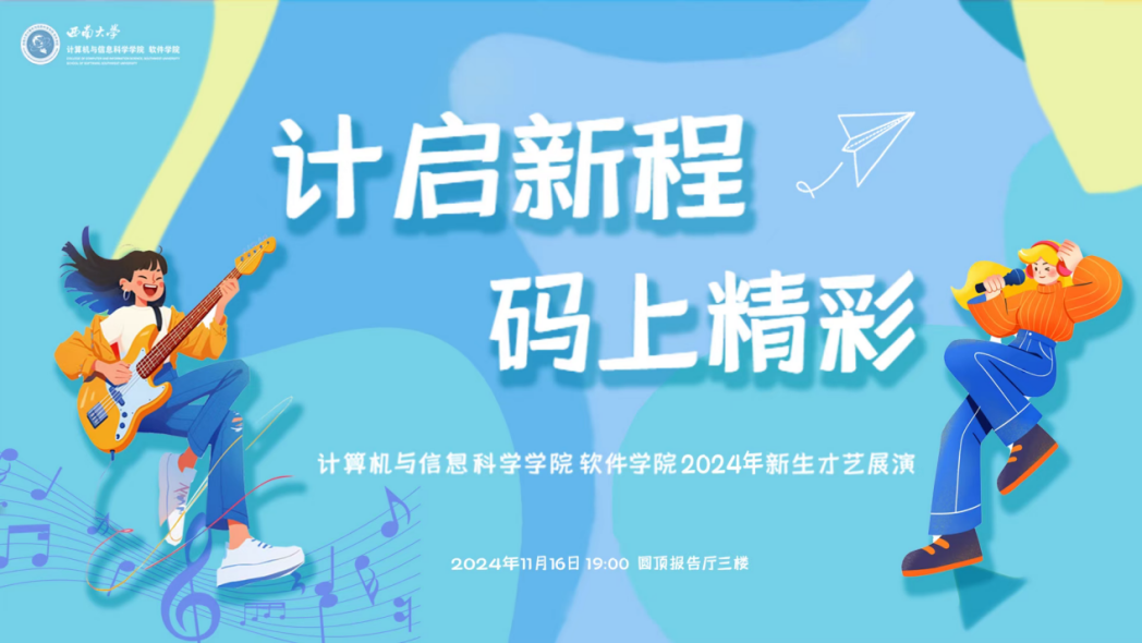 2024年11月16日晚,学院“计启新程,码上精彩”2024年新生才艺展演在圆顶3楼学生活动中心举行。在这充满激情与创意的夜晚,学院本科学生与辅导员、班主任老师们齐聚一堂,共同编织了一段难忘的回忆。现在,就让我们穿越时空,一起回顾那些熠熠生辉的精彩瞬间。