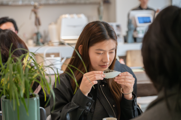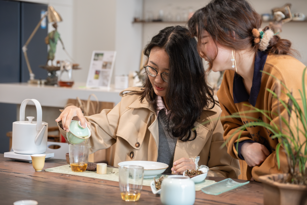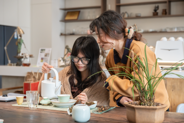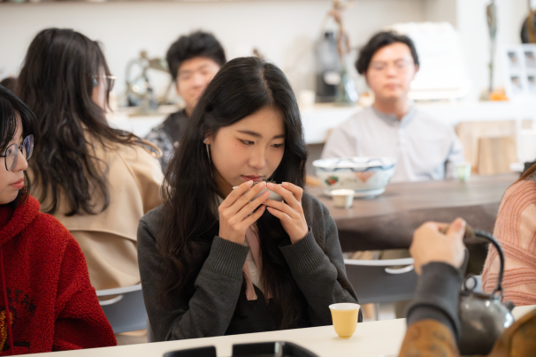 活动的第二部分为品茶鉴茗,伴随着余韵悠长的古琴声,茶艺老师以端庄的仪态、娴熟的技艺向同学们展示完整的茶艺演示,令同学们的心渐渐沉静下来。茶艺老师将茶文化的缘起与发展娓娓道来,“不同天气和心境泡出来的茶不一样,好的茶泡出来是茶汤,余韵浓厚,口感带点绵绸。”茶艺老师通过沏茶、赏茶、闻茶、饮茶等知识讲解,引领同学们逐步感受茶道的艺术魅力。最后在茶艺师指导下初试茶艺,并与老师交流饮茶文化,收获颇丰。