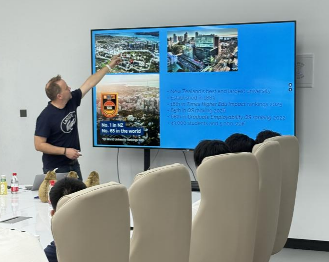 交流会上,Sebastian Link副部长围绕同学们关心的核心问题展开分享。在课程安排方面,他详细介绍了奥克兰大学针对国际学生制定的特色课程体系,不仅涵盖了前沿的专业知识,还注重理论与实践的结合,为学生打造扎实的学术基础。谈及未来发展方向,Sebastian Link副部长结合当下行业趋势,从学术深造、职业发展等多个维度,为同学们描绘了在奥克兰大学学习后广阔的发展前景。同时,他着重强调了奥克兰大学的优势,如优质的教育资源、多元包容的校园文化、先进的科研设施以及丰富的国际交流机会等,让同学们对这所知名学府有了更全面、更深入的认识。