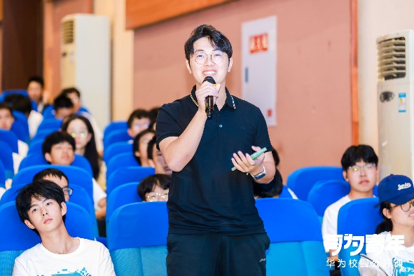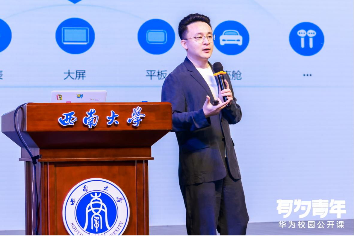 在专家分享环节,华为重庆终端业务部总经理闻修宇先生围绕“创新引领未来 · 共建鸿蒙世界”,深入浅出地讲解了HarmonyOS的创新理念与技术优势,为同学们提供了一次难得的了解HarmonyOS的机会。闻修宇先生讲解了HarmonyOS的构建理念、技术特点等核心内容,现场同学们听得津津有味,互动交流不断。问答互动环节更是引发了热烈反响。同学们积极提问,与闻修宇先生进行深入探讨,现场氛围十分热烈。