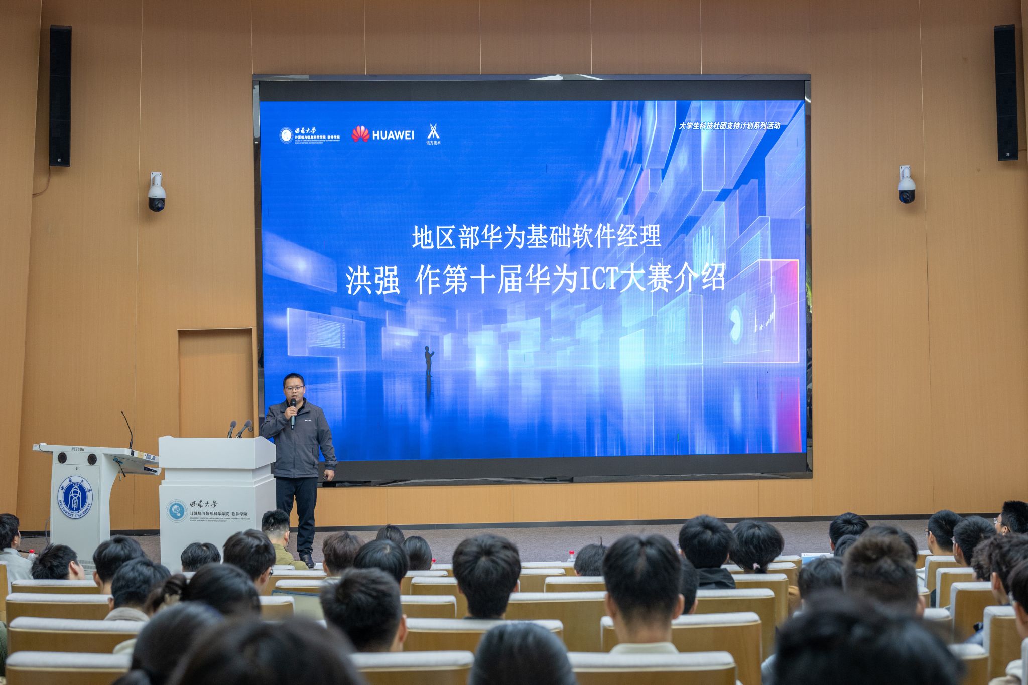 2025年10月27日下午,PA视讯PA视讯 软件学院在25教一楼报告厅隆重举办了2025年“IT文化节”启动暨第十届华为ICT大赛中国赛PA视讯站路演活动。华为技术有限公司代表、PA视讯校团委副书记李立、学院党委书记易鹏、院长罗辛、党委副书记王晖、副院长陈武、教师代表以及200余名本硕学生代表共同参与活动。活动由院团委书记杨靖欣主持。