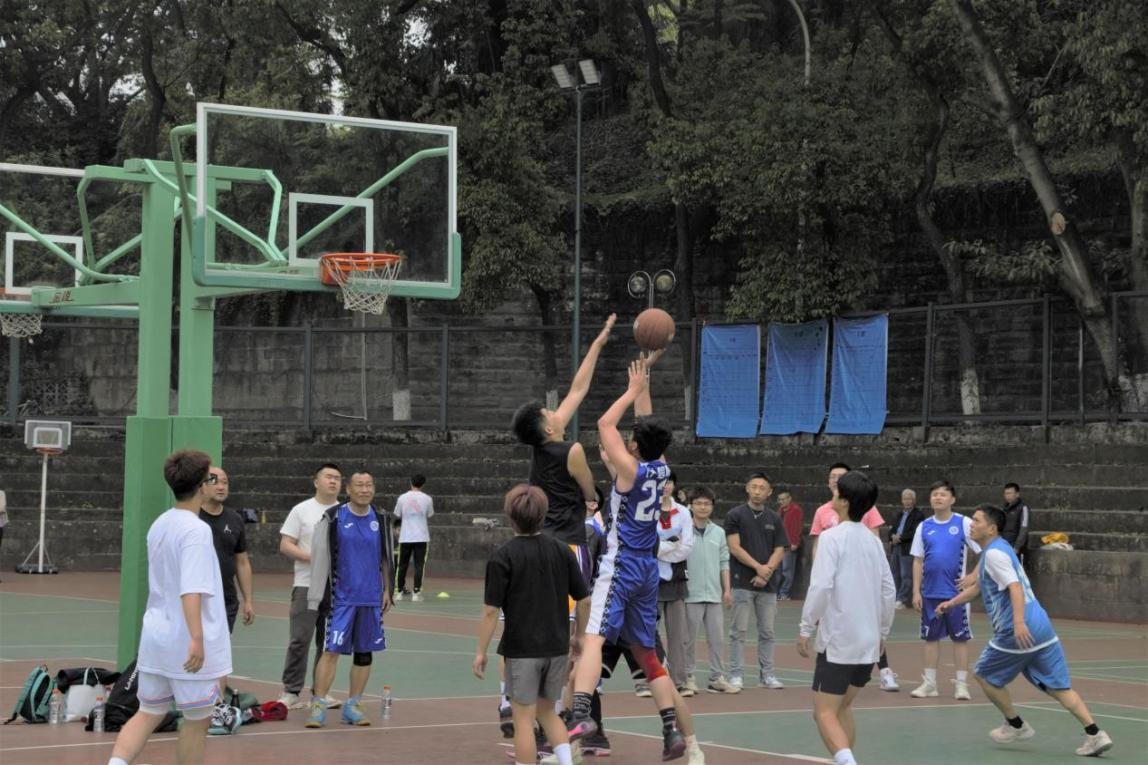 篮球场上,“师生篮球赛”也如火如荼地进行,扣篮、传球、奔跑,篮球在老师和同学们的手中焕发生机,他们用热爱与拼搏汗洒球场,精彩的比赛让场边的拉拉队们发出阵阵欢呼。