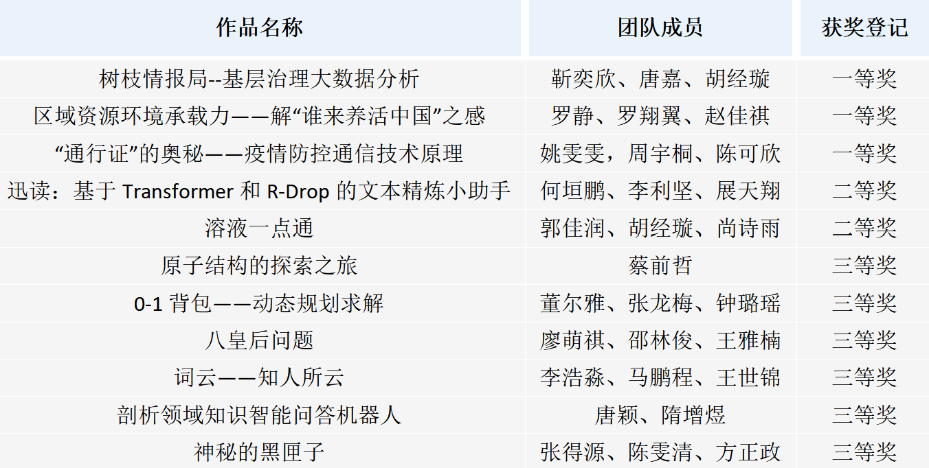 在2022年(第15届)中国大学生计算机设计大赛重庆市级赛中,计信学子们积极参与,荣获佳绩。以下为计信学子在本赛事中的获奖情况: