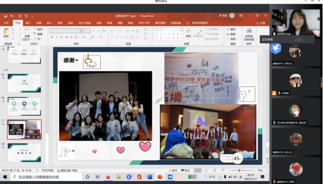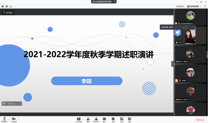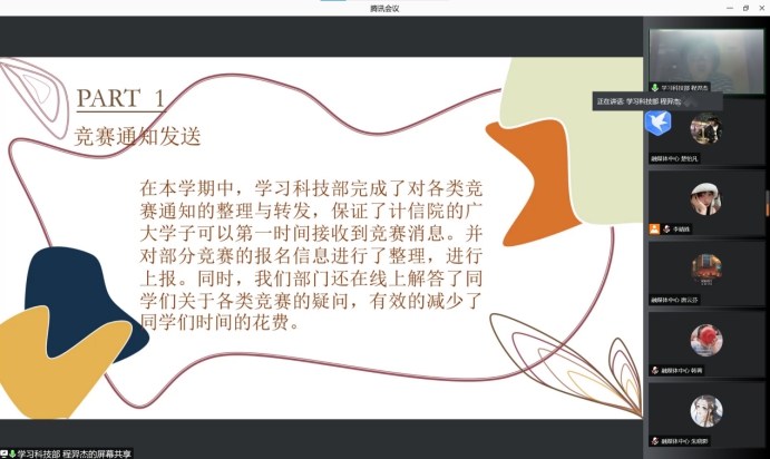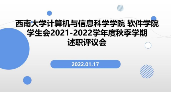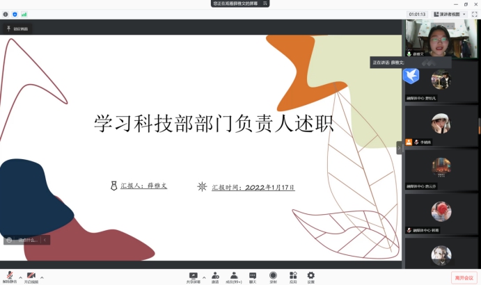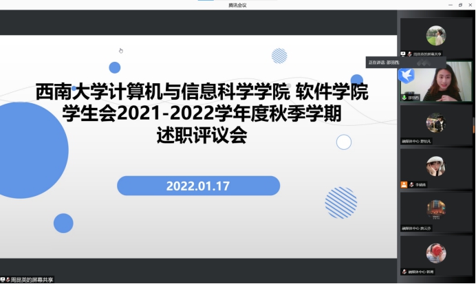 为深入贯彻落实党的十九届六中全会精神,进一步深化学生会组织改革创新,2022年1月17日,PA视讯 软件学院2021—2022学年学生会述职评议会在腾讯会议召开。学院团委书记邵羽西老师、学生会主席团成员和各部门负责人参加会议,会议由团委副书记周昆英主持。