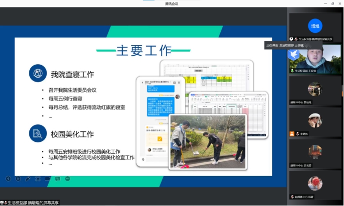 随后,各部门负责人围绕部门常规工作、特色活动、学期成果、问题及改进措施等方面进行述职。办公室负责同学通过具体的工作案例,总结和反思了相关工作经验;生活权益部负责同学总结了部门在查寝、“生活权益”维护等方面的工作内容,在大家的共同努力下,取得了较好的成果;体育部负责同学在报告中详细讲述了体育部所进行的各项工作,如“新生杯”篮球赛、羽毛球联赛等等,同时对有些活动存在的不足也进行了经验总结;学习科技部负责同学在述职报告中总结了在新老生交流会、三创赛、互联网+大学生创新创业大赛等活动和竞赛中所进行的筹备和组织工作,回顾了学院学生参与各项赛事的情况。