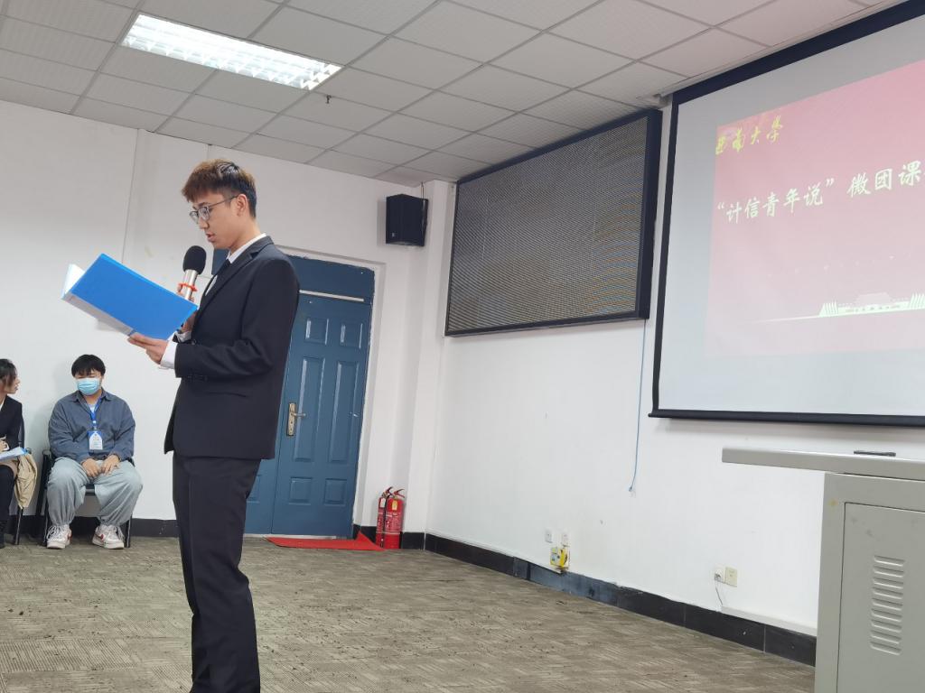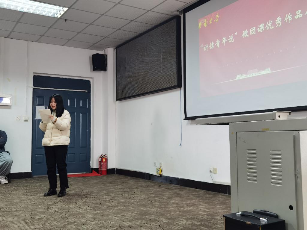 接着是“计信青年说”微团课优秀作品展示环节。作品优秀的有以下支部:2021级计算机科学与技术普通2支部,2021级计算机科学与技术普通1支部,2021级计算机科学与技术师范1支部,2021级软件工程2支部,并由各班团支书分别上台讲述他们的创作思路与感想,讲述他们为什么这样创作,从本次活动中学到了什么。