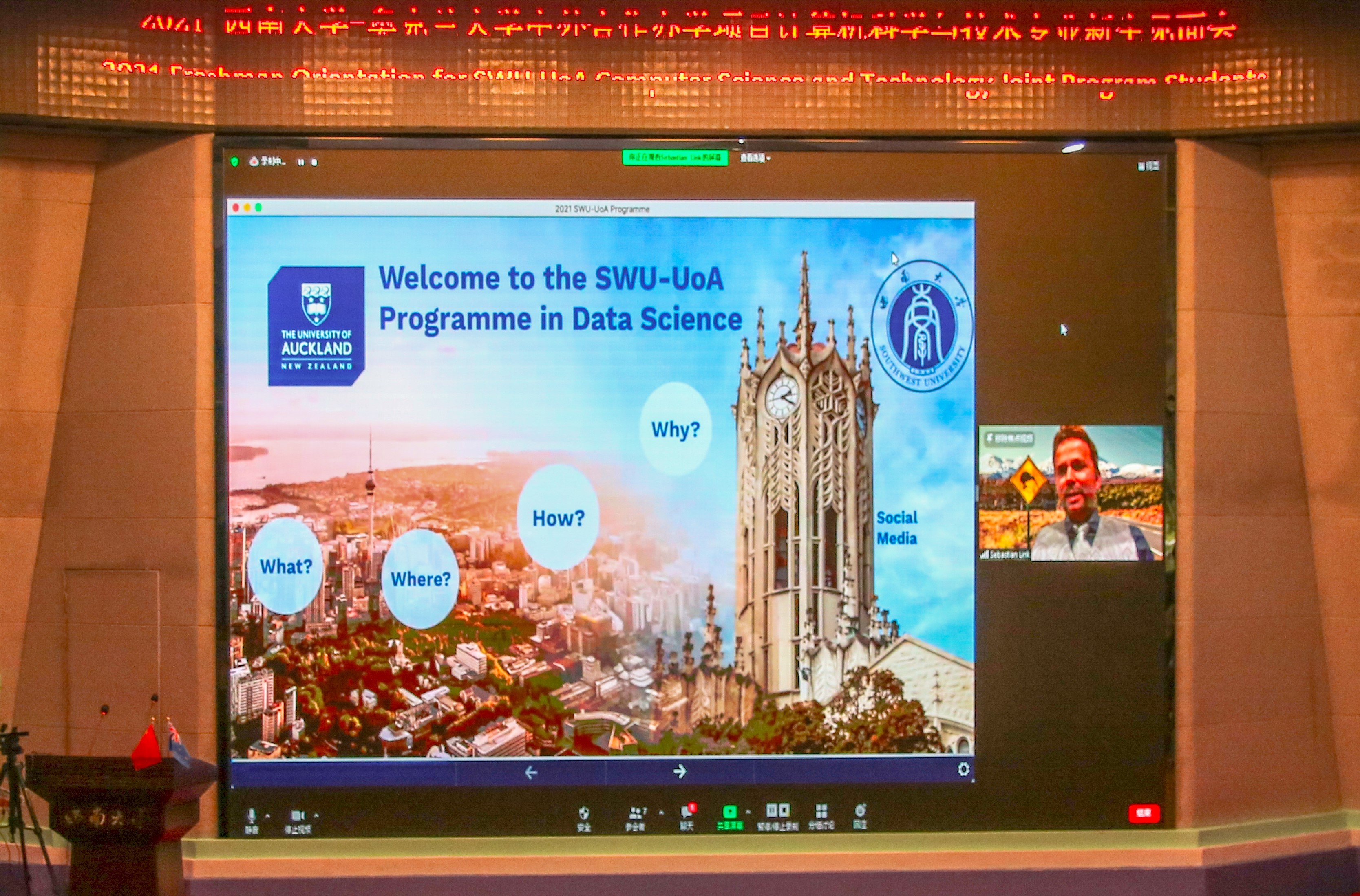 2021年10月22日下午,由我校与新西兰奥克兰大学(The University of Auckland)合作举办的中外合作办学计算机科学与技术专业本科教育项目召开了2021级新生见面会。受新冠疫情影响,此次会议采取中方线下集中,外方在线参加的形式举行。出席会议的有奥克兰大学理学部副部长塞巴斯蒂安·林克教授、国际部国际项目经理解立女士;PA视讯PA视讯副院长韩毅教授、副院长陶丽教授、计算机科学系吴松副主任、2021级辅导员夏浩然老师、国际化工作秘书刘剑岚;AEMG大学西南区域总监汤兴华教授、西南区域督学李长泰教授、陈静部长、邰一宁部长、陈思迅主任、王番主任,以及其他工作人员和2021级计算机科学与技术专业全体新生。本次会议由学院党委副书记陈智老师主持。