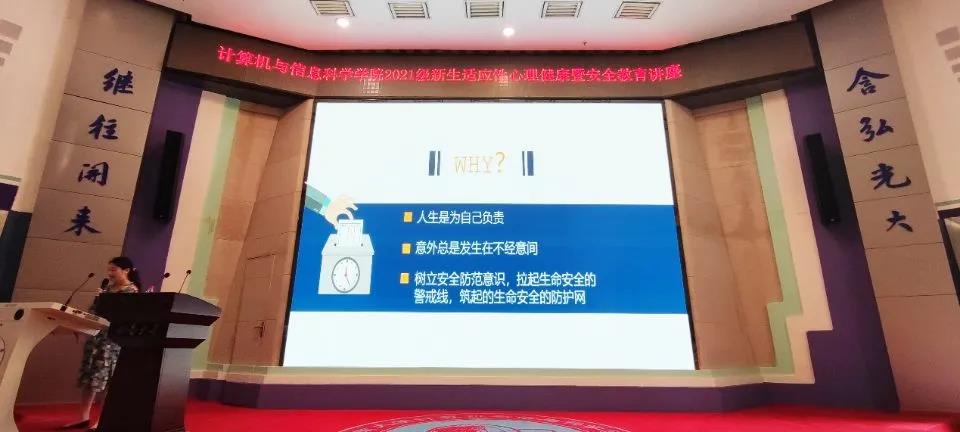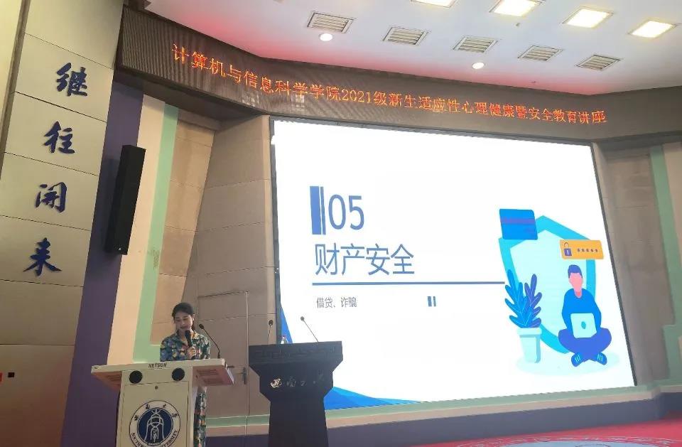 9 月 27 日下午,PA视讯 软件学院在 25 教一楼报告厅面向全体新生开展入学安全教育讲座。学院团委书记、2021 级辅导员邵羽西老师担任主讲,2021 级全体新生聆听了讲座。