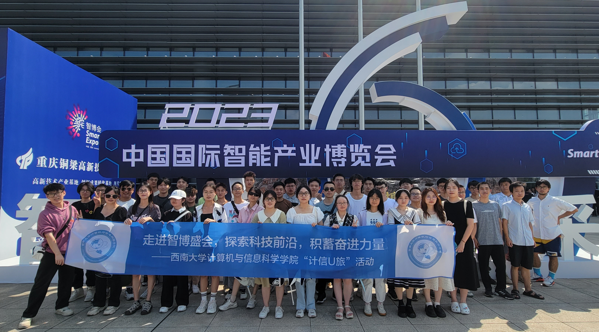 2023中国国际智能产业博览会于2023年9月4日在重庆国际博览中心隆重开幕。为开阔学生视野,了解数字经济和智能产业发展科技前沿,9月5日下午,学院组织了150余名本科生、研究生组成的观摩团前往2023重庆智博会参观学习。