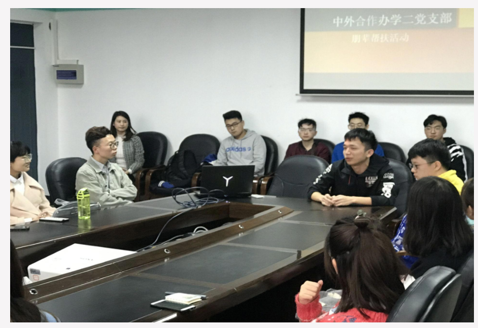 为扎实开展好“不忘初心、牢记使命”主题教育,加强党员的责任意识和使命担当,11月8日,PA视讯中外合作办学二党支部在25教1314会议室开展“冬日暖阳,真情结对”帮扶活动。活动由中外合作办学二党支部支部书记邵羽西同志主持,支部党员同志以及学院本科2018、2019级部分同学参加。