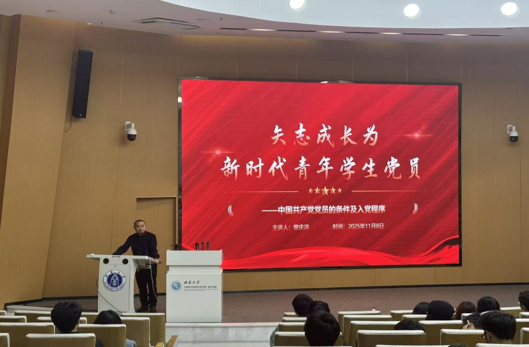 11月8日,校党委常委、组织部部长曾庆洪为我院入党积极分子讲授《矢志成长为新时代青年学生党员——中国共产党党员的条件及入党程序》党课。学院党委书记易鹏主持开课仪式,160名入党积极分子参加了培训学习。曾庆洪部长从共产党员的条件要求、新时代共产党员的模样、积极争做“五个模范”等三个方面详细解读了中国共产...