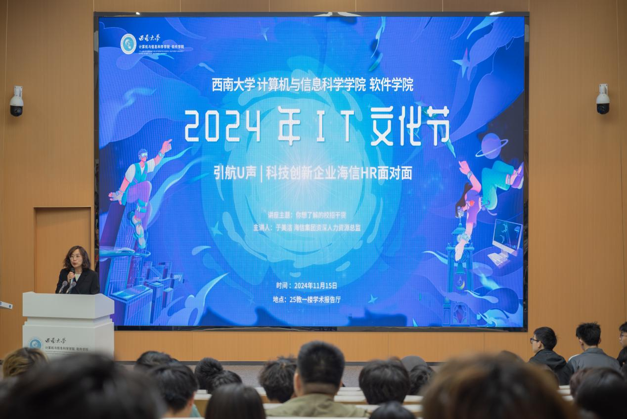 11月15日下午2点,PA视讯PA视讯 软件学院2024年IT文化节正式启动,首场活动“引航U声|科技创新企业海信HR面对面”在25教1楼学术报告厅隆重举行。海信集团资深人力资源总监于美洁女士、学院党委副书记王晖、团委书记杨靖欣、辅导员唐瑞萱及学院200余名同学共同参与。活动由2021级辅导员夏浩然主持。图1:...