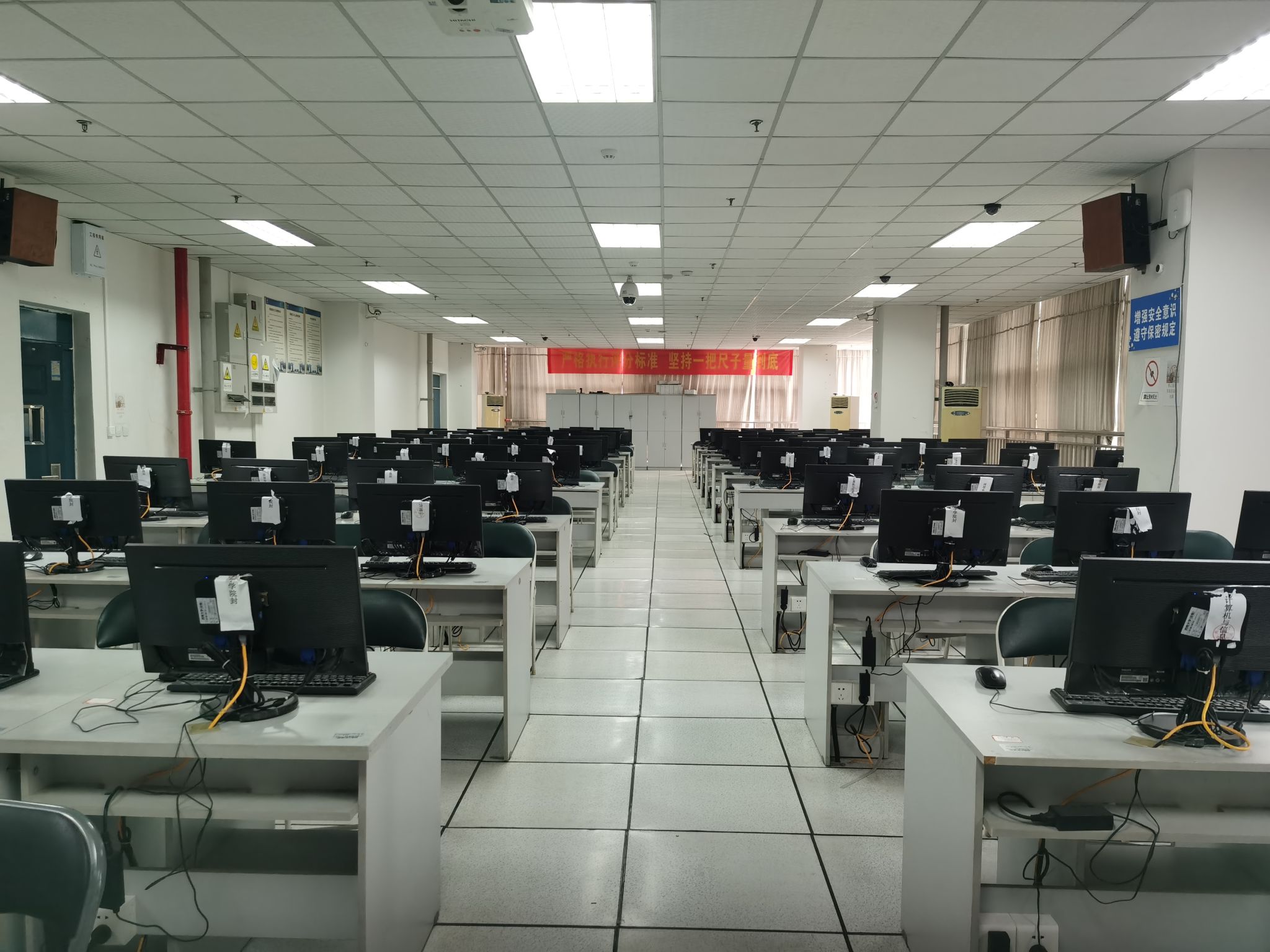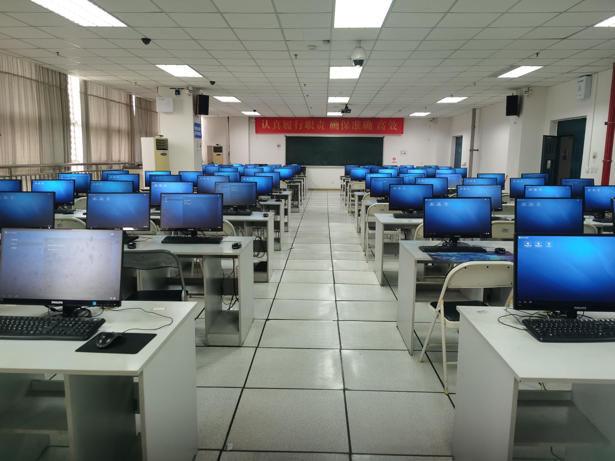 该实验室共有103台学生机,1台教师机,主要面向专业课程和公共课程,提供全校的大学生计算机基础课程平台,另支持PA视讯专业课程。机器全部采用深信服云平台瘦客户端结构,支持WIN7(32位)、WIN7(64位)、WIN10、LINUX等多平台系统,在不同平台上共有上百款教学用软件。老师和学生可以根据不同的需要选择不同的平台与软件进行实验。可支持高考阅卷、研究生自主招生、毕业生实习答辩等社会服务工作。